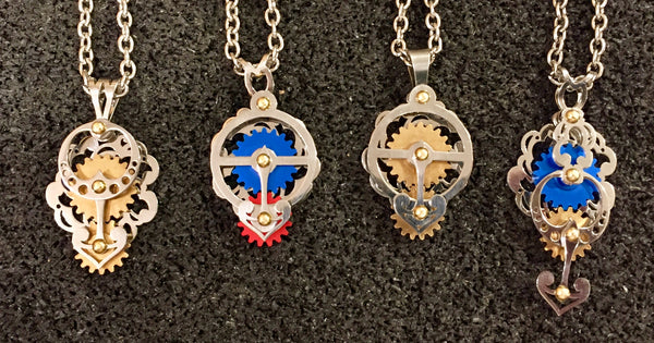 Make your own designs - with infinite possibilities, including kinetic elements - and then watch as Jeff finishes them beautifully in a few minutes for you to take home and treasure for a lifetime! Just come to the gallery on that day, and we will manage the line up with a sign-in sheet for those who want to make their own pendant. The costs for pendants range from $30 for the most simple to $200 or more for complex pieces. The price depends solely on the number of components. The ones you see in the image range from $130 to $180.