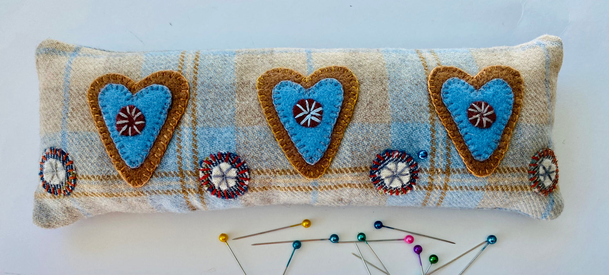 9" long x 2.75" wide x 1" tall | crafted from vintage wool and filled with organic crushed walnut shells to keep pins sharp