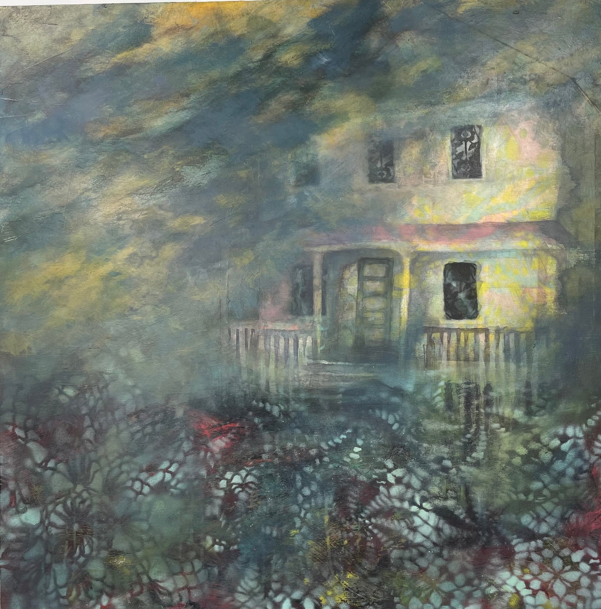 Stormy, 2 story with porch, lace in foreground