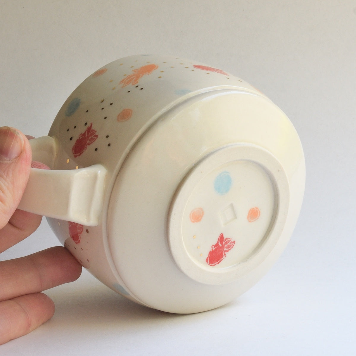 Round porcelain mug, decorated with goldfish in a current of gold lustre dots. 10 cm diameter, 7.5 cm tall, 14 fluid oz capacity.