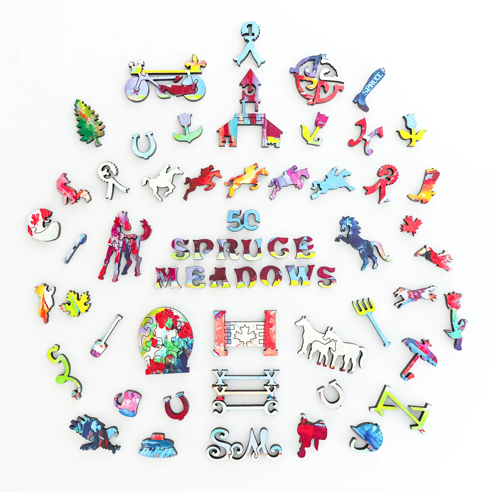 Created to commemorate the 50th Anniversary of Spruce Meadows, our puzzle designers, Siri Olson and Jasen Robillard, have meticulously embedded over 30 unique whimsies. As you piece together the 455 pieces, you'll embark on a scavenger hunt through 50 years of Spruce Meadows history, lore, and culture.