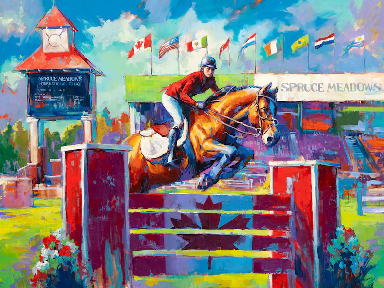 Experience the power and elegance of Spruce Meadows with The Meadows' Breeze, a stunning new jigsaw puzzle that captures the thrilling action within the International Ring at the Masters. This is our fourth collaboration with acclaimed Calgary artist Dimitri Sirenko, who has once again brought a dynamic scene to life—an equestrian show jumper and horse in mid-air, leaping over the famous Canada jump. In the background, you'll find the recognizable Clocktower entrance and grandstands of the International Wing, all depicted with a sense of fluid motion and raw beauty.